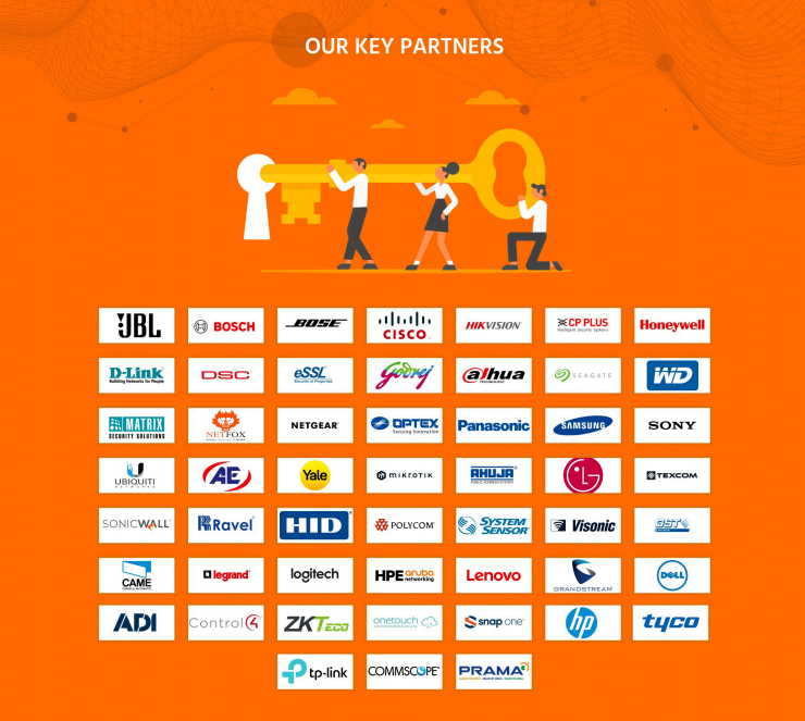 - Partnered with HP, Cisco, JBL, Hikvision, Bosch, Legrand, CP Plus, and more
